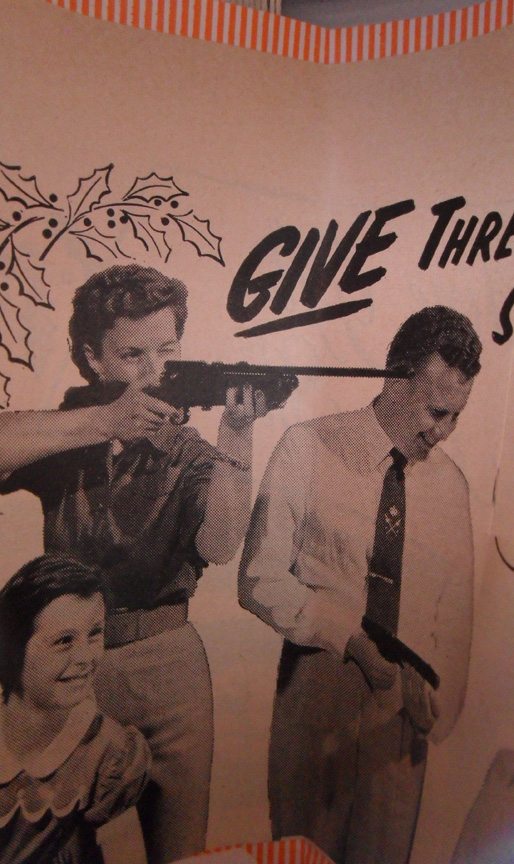 Result? Not exactly a beautiful work of art, but I have to say I really enjoy the creepiness factor of the final piece. The people in the images all seem to have that 1950s plastered on smile, but their actions tell a strange story. One of my favorite pics is inserted inside the “house” and viewed by peeking through a window. The family is practicing their shooting, but it appears as if the wife has a gun pointed at hubby’s head while the children smile approvingly.Day 5: Fifties Inside DetailDay 5: Canned 50s Picket Fence