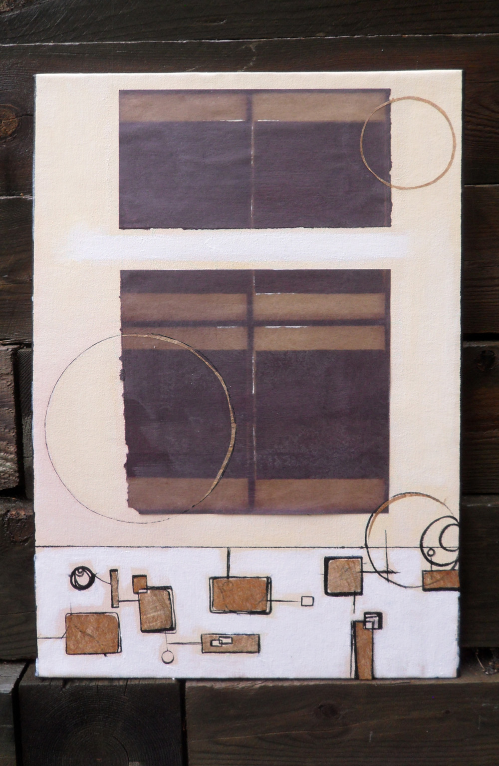 I painted a 22.5″ x 16″ canvas, applied acrylic coat to the paper and began painting and adding other cut paper. The geometric imagery at the bottom was much busier initially, which was really distracting, so I painted a good deal of it away. As for the color, a brown palette is not one I’m real chummy with, but I wanted to keep the bleached paper basically unchanged so thought I’d give it a whirl.