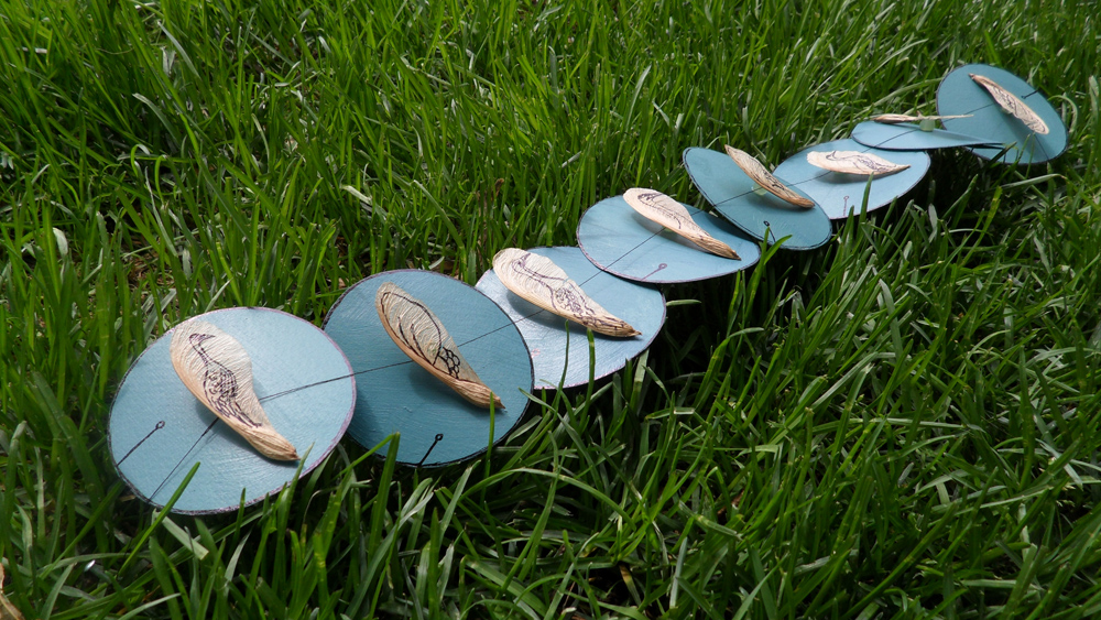 Because I had enjoyed day ten‘s exploration of the leaf looking seed things so much (two semi-trustworthy people have informed me they are a type of maple seed), I thought I’d try my luck with them again. My approach this time around was two-fold: I wanted to see if the textured seeds would lend themselves well to a more intricate, detailed design and I also wanted to focus on a new way of displaying and arranging the work.