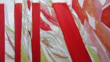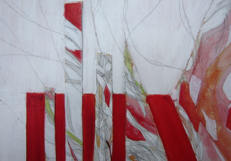 Yesterday I pulled out the canvas and created this non-representational piece. The work feels quite different from my typical approach with its geometric, bold red areas, but it has grown on me. I’d like to say I hope to create more of these, but strangely, I haven’t been able to get the marks to show up again.