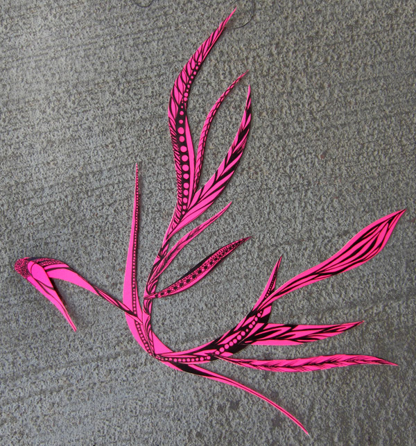 Yesterday I pulled out my trash/resources/treasures/stuff – which happened to be scraps that I had kept from day 101‘s cut paper project. I glued pieces together to create an abstracted bird and then began drawing. The final piece seems to flow and float. And while pink is definitely not my favorite color, I’m a fan of the contrast of black against the fluorescent. I am contemplating creating a whole slew of these. I am interested to see what a whole flock, hanging together would be like.