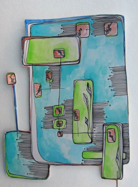 Perhaps it is the color combination juxtaposed to the geometric shapes, but for whatever reason, when I look at this little watercolor/ink piece, I am reminded of the Jetsons.