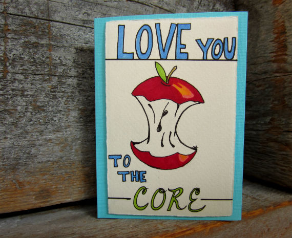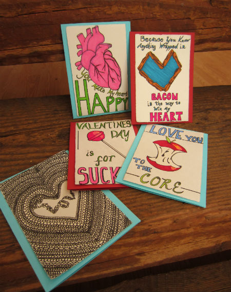 My aim was to create cards that were a bit off the beaten path and to also have fun with the things. I feel like I achieved both goals. The lettering isn’t perfect, but somehow that doesn’t bother me at all. It lets you know the cards were hand-crafted. I also like that the imagery and messaging runs from slightly sappy to funny.