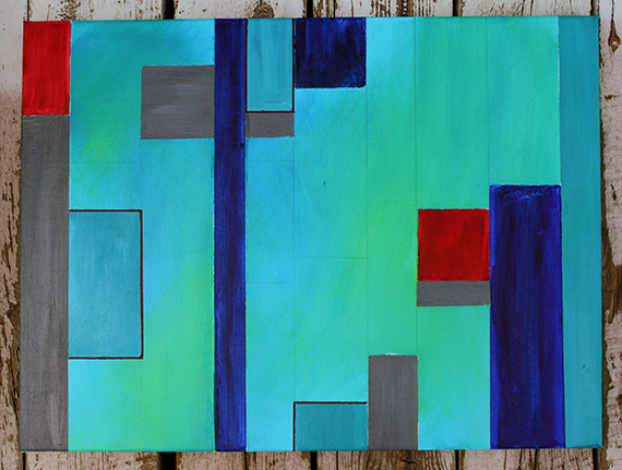 Originally I had planned for the base composition to be comprised of many, many rectangular shapes (you can still see some of the lines which I might still include,) but as I got going I realized I wanted to incorporate the green/blue wash. I worked backwards and had to tape off all of my blocks and then add the wash. Needless to my order of operations got all outta whack, but it still works just fine.