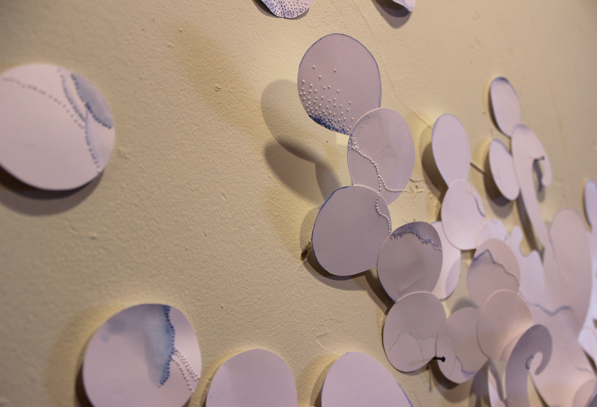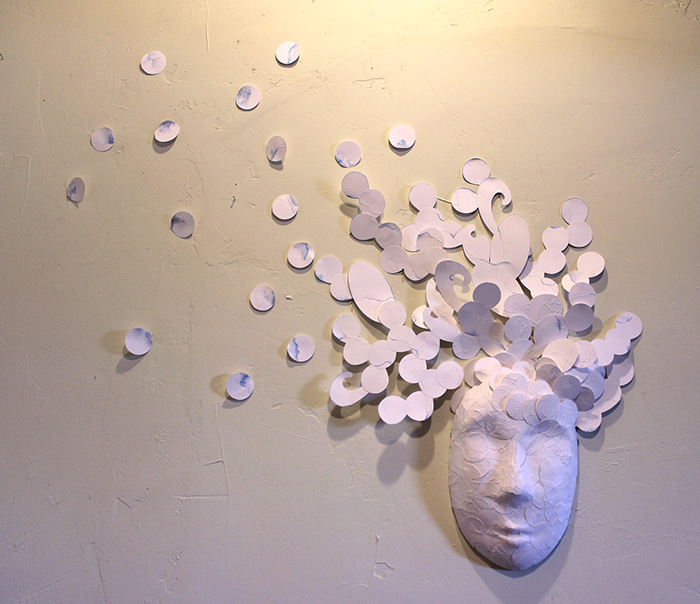 A few posts back I lied. I said I was done with my mask, but the more I looked at the thing, the less I liked it. So I pulled it from the board it was on, added a tiny bit of blue, got rid of a bunch of the circles and am now much more pleased. I can finally deliver this thing! Phew. I thought I might never be done with it.