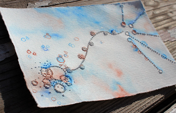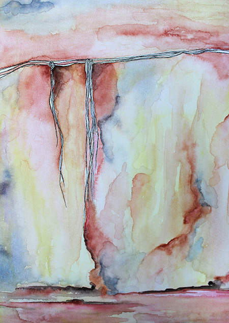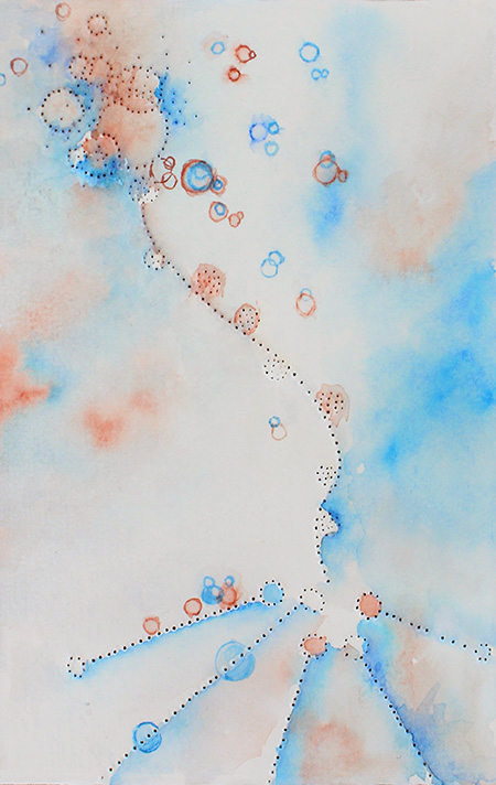 I came across a piece of paper that I had stained with tea years ago. It was a soft brown with a tiny area of darker pigment that I wanted to emphasize. Tracing around one edge of the area and then drawing outward, I built an abstracted mountain range. A touch of watercolor was all it needed to feel complete.