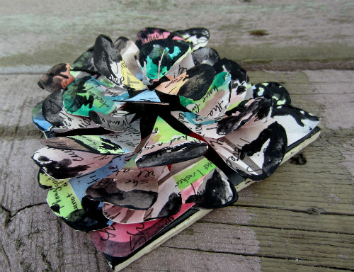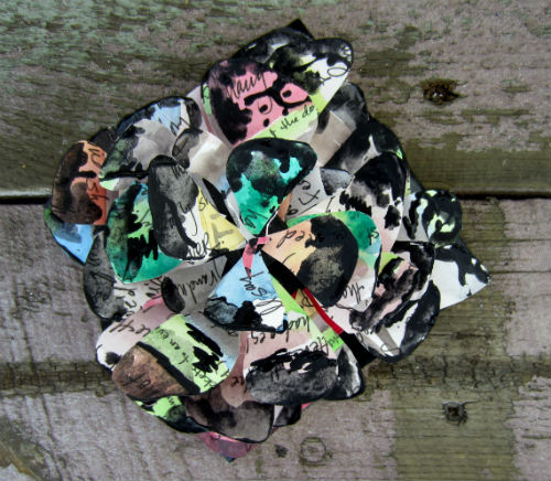 I woke up this morning and realized the painting had helped me deal with my loss and that was all I needed it for. Now I could move on. I cut it up and turned it into this strange, dark flower. A gorgeous work? Not necessarily, but it did accomplish what I wanted – to keep the original words and images I created about my grandma dying private, while allowing me to continue to share my work.