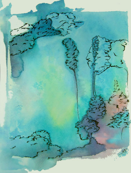 I decided it was time to try something a little different yesterday – something of which I had a little less control over. I pulled out some watercolors and began painting a loose design directly onto a piece of glass. I then grabbed a sheet of watercolor paper, soaked it down, and pressed it onto the painting. The result was a very loose wash of color that brought to mind a misty forest. After letting the paint dry, I drew in trees and other forms to create an abstract landscape.