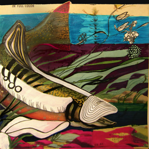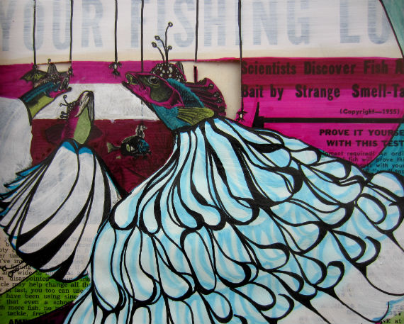 I pulled out an old 1955 Field & Stream magazine and used the cover art (by Tom Rost) to create my own piece of appropriated art.  This was a great exploration for me. It allowed my brain to play with space and design a bit. I kept portions of the original fish, while adding blocks of color and line throughout the rest of the piece.I love the idea of keeping a portion of the old to influence what is new – a bit of a metaphor for life, I suppose.
