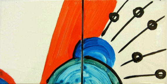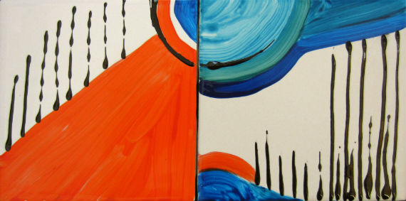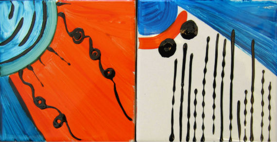 Another day, another chance to paint on tiles. After deciding the grasshopper tiles I painted the other day would be fun as part of a backsplash, I began thinking more broadly on the subject. I envisioned filling all of the wall between the cabinets and counter with colorful tiles. It would be one of a kind – really cool and vibrant. Nothing realistic, just non-representational patterns and design mixed and matched.