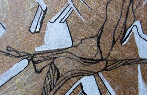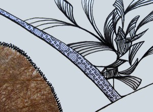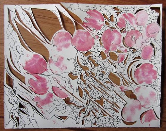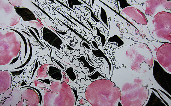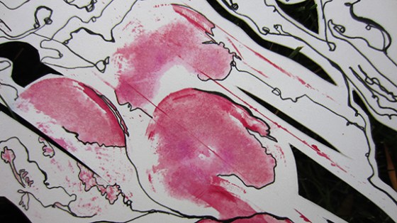 Inspired by day 163’s piece in which I created drawings by finding pattern in the paint, I hoped to explore a similar path for yesterday’s work. I started the process by pushing beets onto paper in order to create the initial design. From there, the stains would act as the base on which my ink drawing would build from – working around the stains on the paper. Once the drawing was created, I cut the paper, working within and around the ink drawing. One step in the process therefore directed the next step.