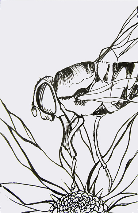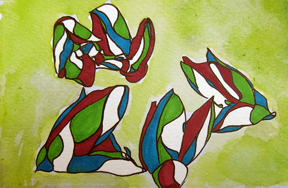 Upon finishing the initial study of the little buds, I decided it would be interesting to break each of the structures up into sections and add color for a bit of dimension. I finished off the graphic little drawing by adding a wash of green watercolor to the background.