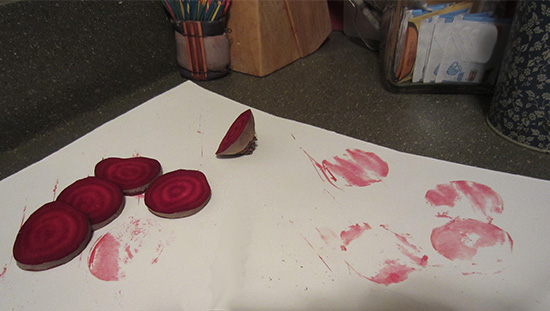 Using natural pigments to create work is something I’ve experimented with in the past. Pomegranates, blueberries, raspberries – they all have a lovely color that stains paper really nicely. So yesterday, after a friend had left some beets for us, I was excited to create a piece using beet pigment.