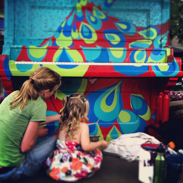 Yesterday I was able to get my piano fully primed (the pink and mint green won’t stay) and ready to go. I must admit I felt a smidge guilty about painting over such lovely wood, but the brightly colored pianos really do liven up downtown.