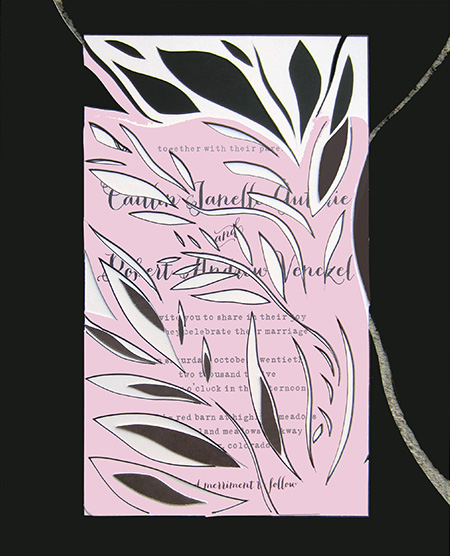 Awhile back we received our invitation to the celebration. It was a 5 x 7″ card in pink and dark brown, with dark brown backing. Upon seeing it I realized I could create some sort of a cut paper design from the card as our gift to them. I wanted to create something that was a piece of art while also reminding them of their big day. Initially the piece had a different backing with much more cut out, but it seemed too ornate. The softness of the pink and the lettering along with all of the curved cut outs was just too much. I opted to back it instead on black and keep the cutouts to a minimum, which I think was much more successful.